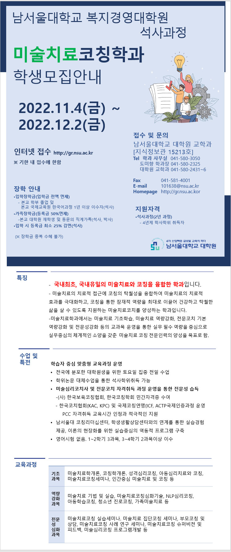 2022 남서울대 대학원 미술치료코칭학과(석사과정) 학생모집 안내